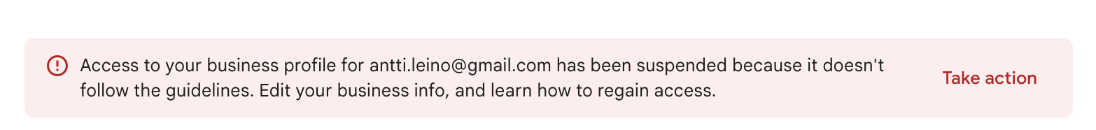 ps. takaisin tähän. Veikkaan, että kyseessä on ongelma, joka minulla on ollut jonkin aikaa. Konsulttifirmani yritysprofiili suljetiin Google toimesta aikaa sitten koska osoite ei kelvannut. Muuttaessani yritin päivittää tietoja ja nähtävästi iso G ei tästä pitänyt. En keksi muutakaan syytä miksi punainen varoitus on päällä. Epäilen että tämäkin voi olla Kauppiaskeskus-ongelman lähde, mutta edes Redditin keskustelupalsta ei auttanut.